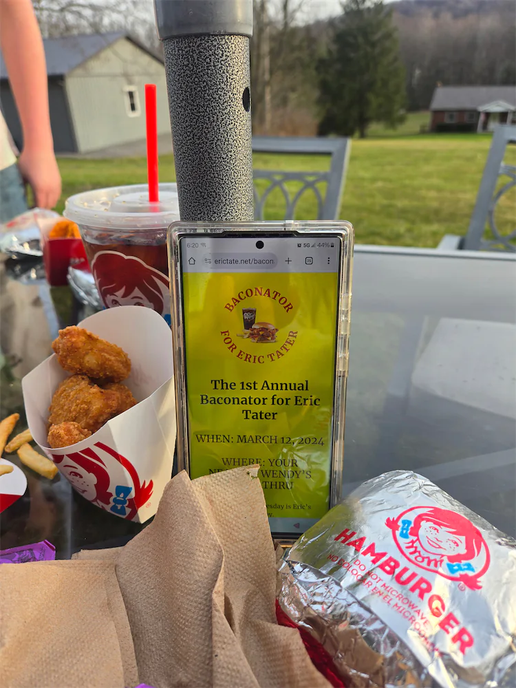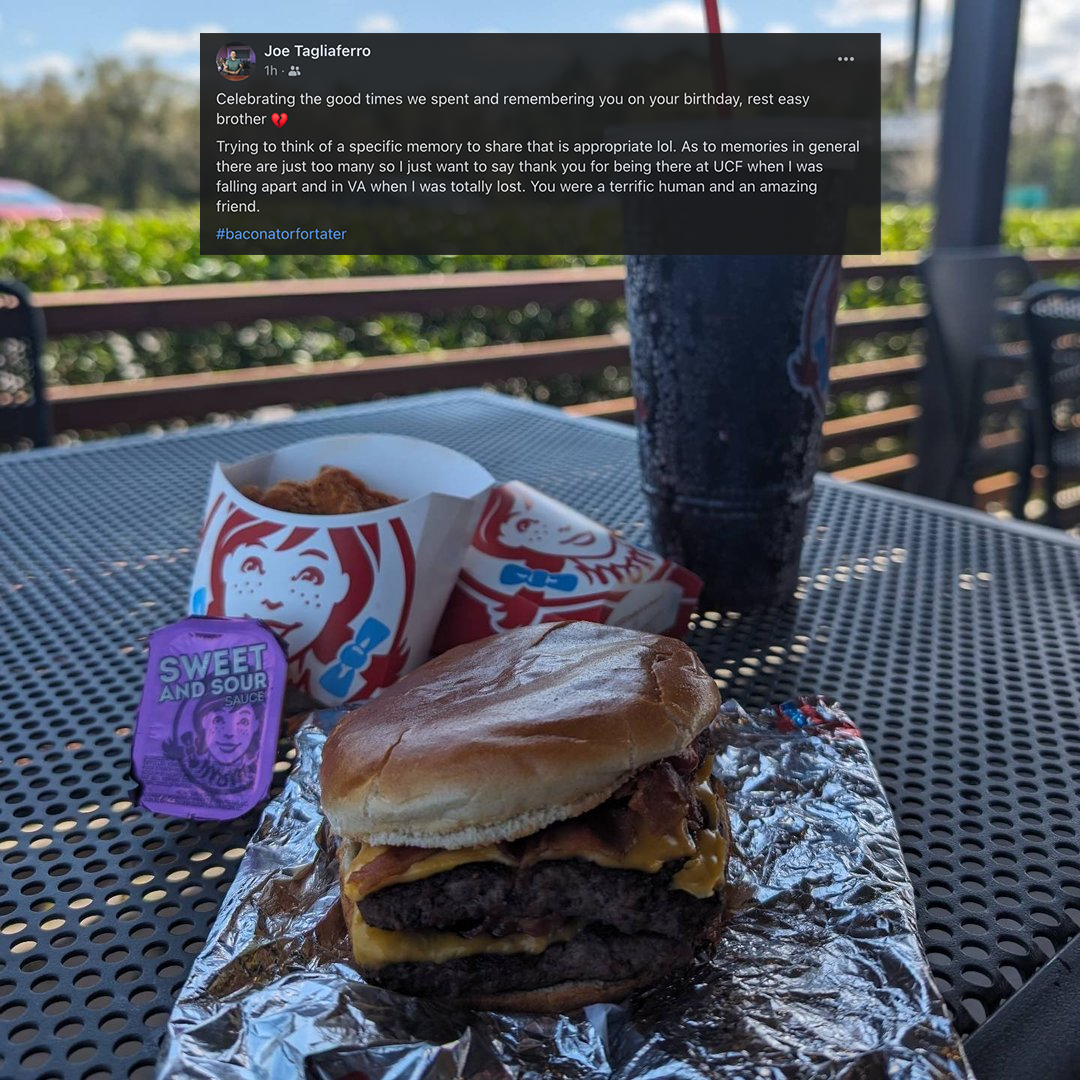 In honor of Eric, go grab yourself a Baconator meal, Dr. Pepper (don't forget the light ice!), a sweet and sour sauce for those fries, and grab your furry friend some chicken nuggets. Make sure to take a photo and upload it using the form below, and post it on social media using #baconatorfortater.